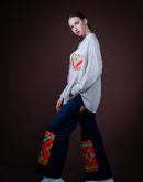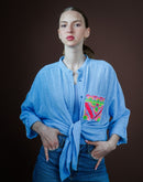 Sa matière légère et texturée épouse le corps avec souplesse, tandis que la poche brodée à la main, aux motifs vibrants, attire le regard sans excès.