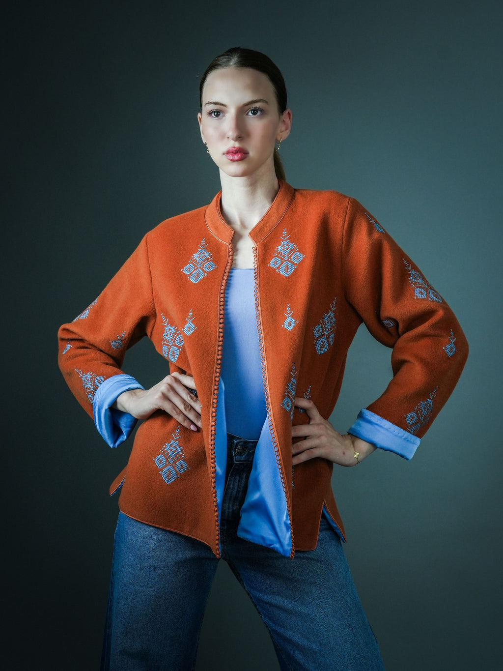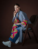 Ce caftan ouvert en denim gris casse les codes : entre structure sobre et broderies berbères en néon éclatant, il affirme une présence graphique puissante.