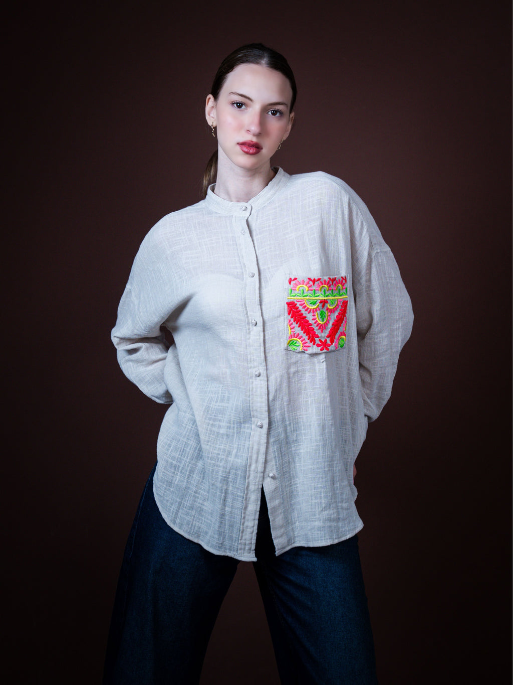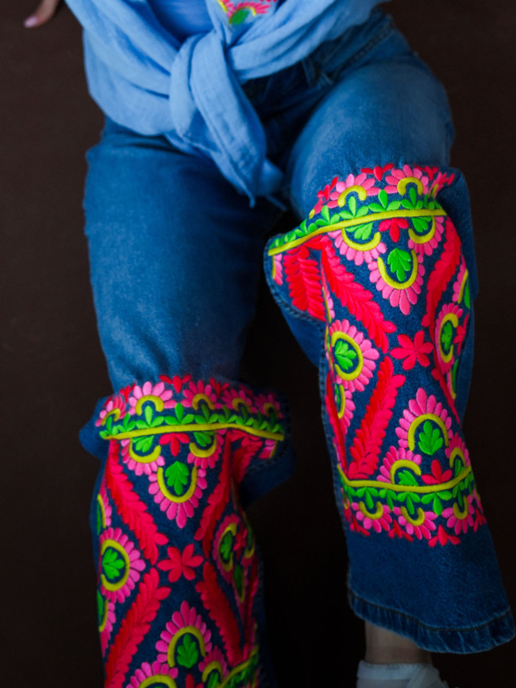 - Broderies artisanales multicolores fluo (rose, rouge, vert, jaune) le long de l'ouverture et sur les manches